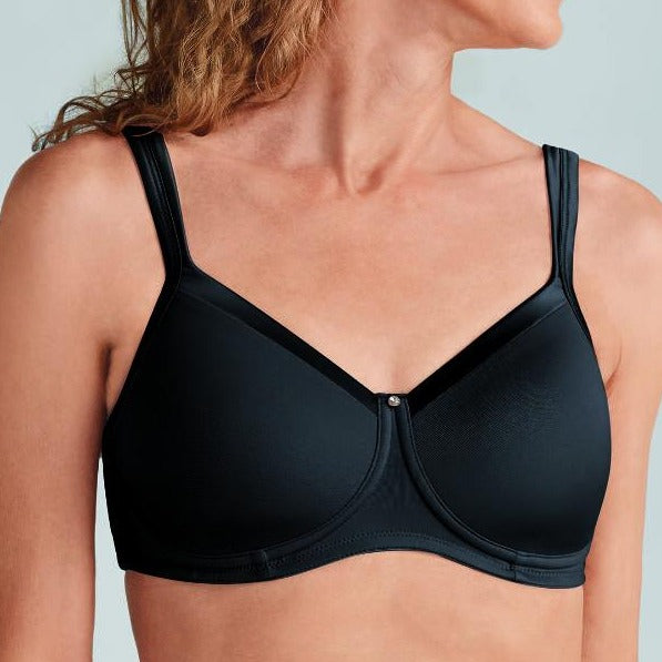An Amoena favorite, the Lara Satin bra offers comfortable elegance with satin trim and a center rhinestone detail. It's a perfect T-shirt bra that looks smooth under clothing.